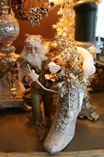 A couple of weeks ago, my girlfriends, Jill, Marlene, Lynda and I took a road trip from Chicago to Kansas City. We have been close friends for over 25 years and have all had professional lives in Department Stores ( Marshall Fields, Robinson's, Famous Barr). So we are all pretty judgemental and very opinionated about retail in general. To make things even more interesting, while Jill and Lynda have retired, crazy Marlene and I now own our own retail venues. So we are constantly looking for other retail stores that inspire us and have found few in the past few years. But what a different story in Kansas City! We were all blown away- in this mid sized , mid west (of all places) city, retail was inspiring!. Nell Hill's new store was sensational - 2 floors filled to the brim with tasty merchandise. We all bought stuff and almost filled my large SUV in that first stop! Next, the Curious Sofa - one of the most beautiful stores that we have ever seen. A vintage tile ceiling, Italian plastered walls, and awesome antique doors greeted you in this strip center location! Lot's of glittered holiday decor, candles, vintage accessories inspired us. And then after an amazing lunch at a little French Cafe across the street(my girlfriends are still trying to figure out how they prepared this amazing tomato salad), off to Miss Frenchies we went! I had been reading about this event for over a year on the Curious Sofas blog. We were not disappointed - it was a blast. A group of artists, antique dealers and store keepers all came together in this magical barn and created a holiday extravaganza. Now our car really was full! But Saturday morning, before we headed back to Chicago, we made a little stop at a local department store - Hall's. When we walked in and saw the Christmas Shop, I began to hyperventilate - we had never seen such a beautiful assortment of holiday decor, since the grand old days of Marshall Fields in the 80's. Gorgeous hand blown ornaments, incredible elves and Santa's, silver, unbelievable tables capes - it was like Christmas heaven. Ten shopping bags later, we had to re-pack the car. Who was going to be tied on top to get home - certainly not my new ornaments! This was an awesome trip, 3 great antique malls too! And by the way, the ribs that we had at Jack Stacks in Kansas City, they were the best that I have ever tasted in my life - I had them overnight-ed for my family to celebrate Christmas Eve tonight!