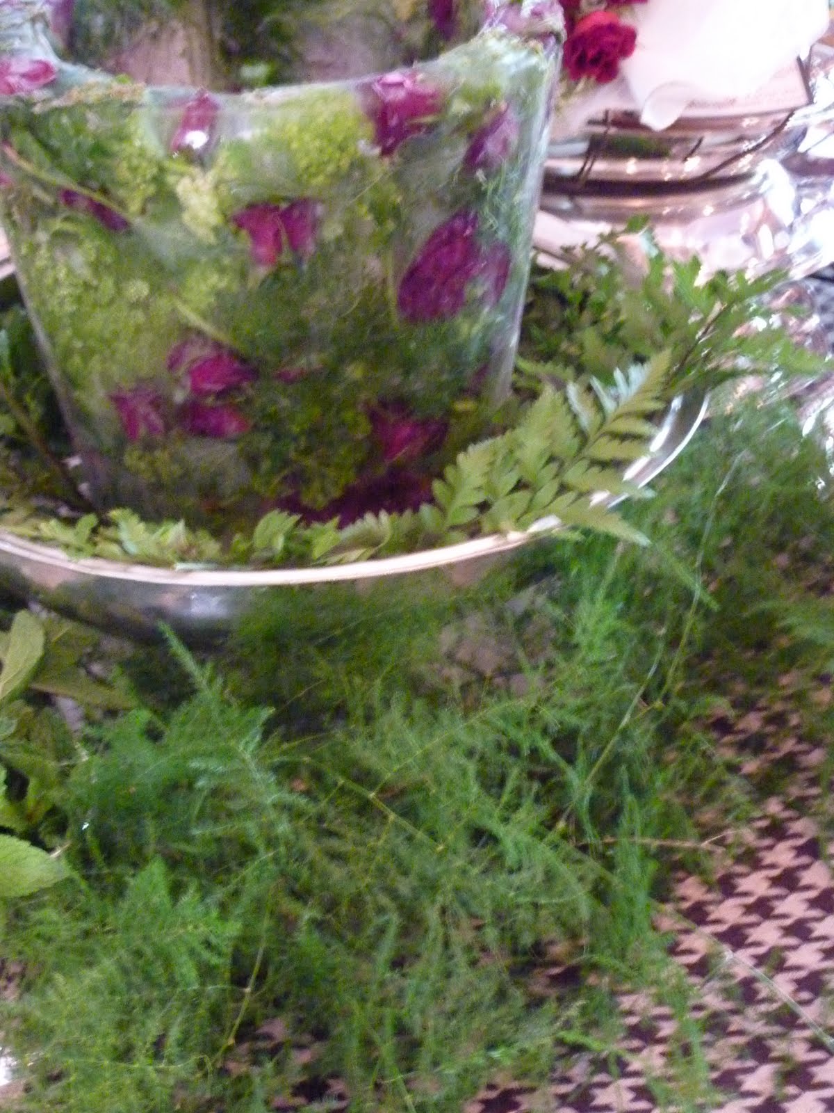 Today was the day for the home tour that we have been planning. As usual, it was hectic at the last moments, getting the final touches on the tables. Nose gays were placed inside of fluted linen napkins, and the ice bucket, made of roses and ferns frozen in ice, was placed on the table. Our Kentucky Derby Box Lunch, served in vintage silver vegetable dishes, was tied with wired twine and a menu label, disclosing the contents, Hot Browns, Mint Julep Pineapple, and Orange Pecan Bourbon Pie. Paper cones on the back of the chairs were made of sheet music - My Old Kentucky Home - and filled with roses, lamb's ear and ferns. Wooden platforms held the silver boxes, and a little knife rest of sugar snap peas was placed on the side to enhance the gold pea pod forks and knives.We used a glass etched of ferns. On the grand server of iron and limestone, we used silver mint julep cups filled with mint and our Orange Bourbon Pecan Tart. A brown and white houndstooth tablecloth was a great contrasting background for the silver lunch boxes.