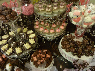One of the most beautiful spots in the world, the Blue Ridge Mountains , was the location of my niece's wedding this past weekend. From the location of the ceremony to the old Packer that transported the bride, everything was gorgeous. The ceremony took place on an overlook on top of Wintergreen Resort. While the guests witnessed a beautiful bride stepping out of the old Packer, escorted by her son and Dad, tears were already flowing from the eyes of many. Morgan was stunning in her formal wedding gown, worn with PINK UGG BOOTS- how cool was that! The table escort cards were displayed around a tree of paper mache created by the bride's aunt. Intricate hand made flowers, tucked in a bed of fresh moss, were used to assign the table for each guests. As the guests entered the dining room, bouquets of hydrangeas, gerber daisies, white tulips, and ranunuculus created a magical room. But I think the favorite thing of all , except the bride, of course, was the exquisite candy table. My sister, Nancy, had gathered an unbelievable assortment of pink, brown and white candy. My daughter Julie, and sister Kathy, helped me display the confections on a round table topped with a ribboned chocolate taffeta tablecloth. Children especially, but plenty of the adults, circled this table several times during the evening. As people danced away the evening, warm memories were made, family reconnected, and the bride and groom smiled. What more could you want!