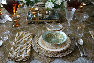 Yesterday, Romancing the Home hosted an event for The Lake Forest Women's Club to review our new book "Romancing the Home Entertains. We set up several tablescapes to illustrate our book's content. This table was for a formal dinner party, but really showed the mixing and matching of china. We used vintage china , mixed with a new line of accent dinnerware that we have in the store. Taffeta was used under a gold bridal lace as the tablecloth. Vintage sherbet and champagne glasses served as votives and floral containers. We made the menu card from scrap booking supplies. The white and gold over sized napkins in the tiger print really updated the overall table, and are also available at the store. Be sure to visit www.betweennapsontheporch.blogspot.com to see other tablescapes on Tablescape Tuesday.