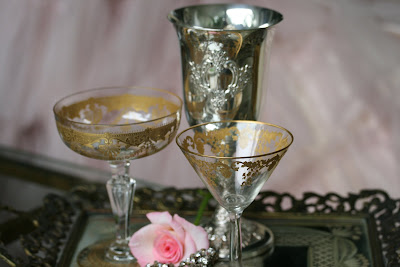 As I am unpacking my treasures from my 3 weeks of antiquing, I become acutely aware of my fondness for beautiful crystal stemware, anything with rhinestones, and most everything pink! The beautiful pink satin prom dress was found in Wisconsin - note the delicious rhinestone buttons. It will be used in the store to display our incredible new collection of rhinestone and crystal jewelry. The gold etched stemware was purchased in the south - mostly in Atlanta. I am collecting individual stems that look pretty together, so our customers can mix and match the glasses. The vintage silver goblets look great with the crystal and will be available at the store. The rhinestone brooch is a find that I can't ever part with - I just keep thinking of different ways to use it- on a handbag, on a dress, or just simply on a pink velvet pillow. One of my favorite finds on this trip was the billowy pink peacock! Can you imagine it in a baby's room or as a centerpiece for a wedding shower? OMG. Needless to say, we have several coming to the store for our customers. Purchasing pink macaroons at Sucre in New Orleans, I have combined them with the gorgeous raspberries for the delicious pink delight in one of the gold etched glasses. Catching up on my blogs this morning, I found this beautiful pink floral cake, the pink cameo votives ( how pretty are they?) and the pink peonies with the silver votives and thought you would also enjoy the pink eye candy!