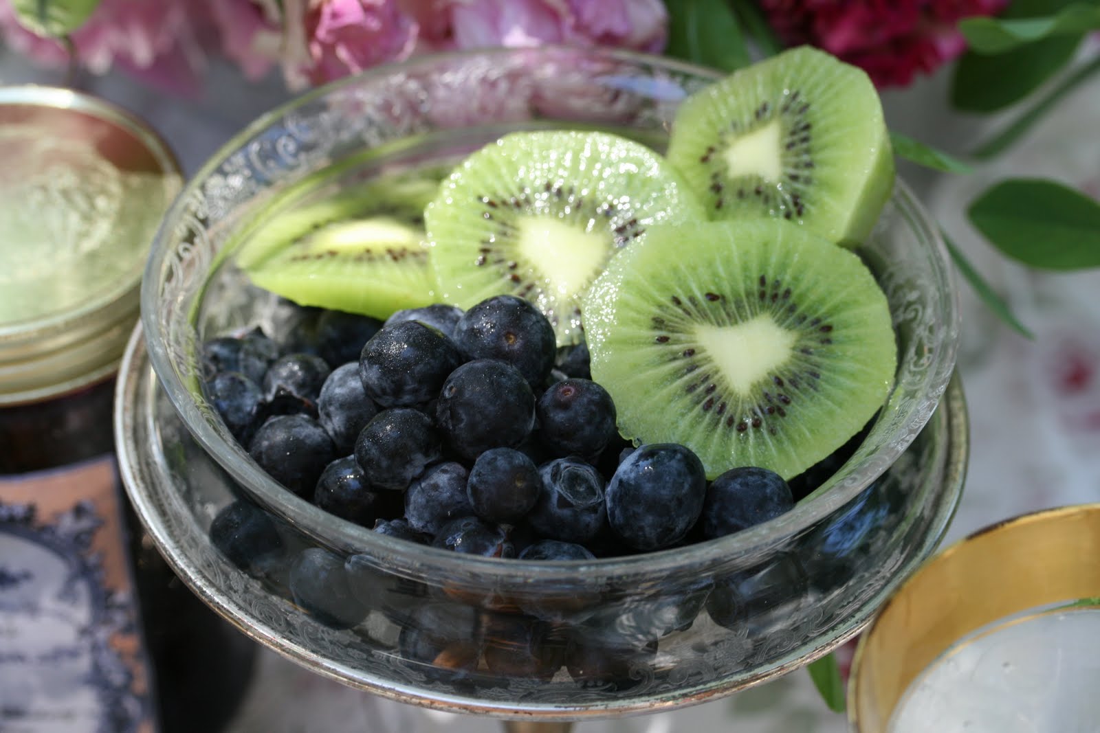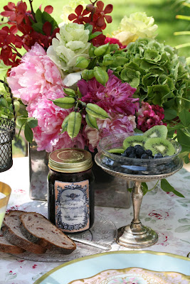 The chance to eat outside without bugs is very rare in Northern Illinois. But today is perfect for breakfast outside on the terrace, no bugs and 78 degrees! A shabby chic tablecloth from Target is the back ground for the Anna Weatherley powder blue chargers. Antique plates, embellished with gold trim and pink orchids, are the perfect size for a light breakfast. My birthday flowers still look great and work well with my outdoor tablescape. The vintage gold rimmed glasses make the orange juice special. My friend Lynda's homemade jam, blueberry and vanilla, tastes awesome on the cranberry walnut toast. Fresh blueberries and kiwis are the perfect accompaniment to the light breakfast. Even a simple meal tastes better when served outside on vintage silver and china! My friend Mariterese has taught me to use "the good stuff" everyday - it makes every meal a special occasion. Why have it if you don't use it !!! Please be sure to visit www.betweennapsontheporch.blogspot.com for other inspiring tables.