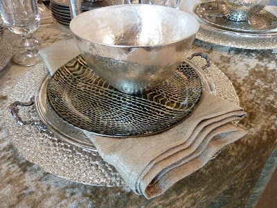 Love this yummy animal skin platinum plate with the platinum napkin on the silver charger.