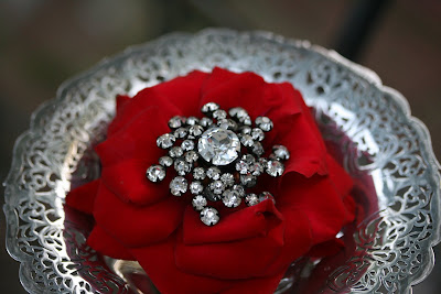 While promoting our cookbook this year, we have held several book signings around a Royal Tea and Royal Dinner party concept. Now we are heading to Tennessee for another book event and I am working on some new ideas to present with a royal theme. This past weekend, I found some fabulous vintage rhinestones and decided to use them with one of our new tablescapes for the event. A decadent Royal dinner is being planned complete with its own Queen Victoria menu. I love this gorgeous picture of Queen Victoria in all of her regal cape and crown glory and decided to use it as the menu cover. Using three of my favorite "R"s, rhinestones, red velvet cupcakes and red roses, we created this fun presentation for serving a red velvet cupcake. Vintage silver compotes serve as the serving dish, elevating the cupcake to a whole new level. Vintage rhinestone trim is secured to the cupcake with rhinestone florist pins, while one pin adds a touch of glamour to the top of the cupcake. A simple red rose is embellished with a vintage pin in another compote to add another touch of red to the table. I am looking forward to finishing the details for this table setting - maybe tartan, toile, and transferware- the three "T"s. Stay tuned for the final design!