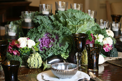 Candy and I were excited to stage the dinner table for this fun event. We were inspired by a half bushel of the most beautiful eggplants - just picked from Wisconsin fields with their green stems still attached! We decided to use a Jan Barboglio candelabra as the centerpiece and layer it's base with fresh kale, white pumpkins, gnarly gourds, eggplants, and little containers of white roses, purple mums, coleus, and fresh parsley. Six of the largest eggplants were hollowed out and used as the vase for little bouquets that went down the remainder of the long 16 foot table. We cradled them in large curly kale leaves to add stability and the beautiful green color. Bronze placemats studded with French nail heads held the Juliska dinnerware. While the room seems stately and serious, we wanted to introduce some playful elements to the table, such as our favorite leopard print napkins and tortoise wine glasses. Simple glass votives were scattered down the table for the romantic touch to the dining experience. We treated the fireplace mantel with six alabaster goblets, filled with white roses and reindeer moss, and added white votives. Please be sure to visit http://www.betweennapsontheporch.blogspot.com/ for other beautiful tables on Tablescape Thursday.