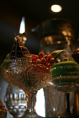 Here are a few pictures of the living room from last weeks Christmas Open House. I just got the antique gilded sofa reupholstered in the new Barbara Barry velvet- a sage, taupey color- very muted and it looks great with the aubusson carpet. A neutral color palatte was used for the Christmas decor in the room, complete with lots of glitter, rhinestones, and velvets. All of the floral pieces used in the mantel are available at Romancing the Home.