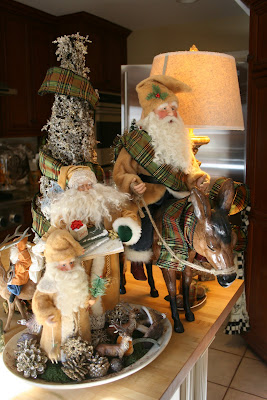 family room vignette of old chalkware Santa's, bottle brush trees and reindeer.