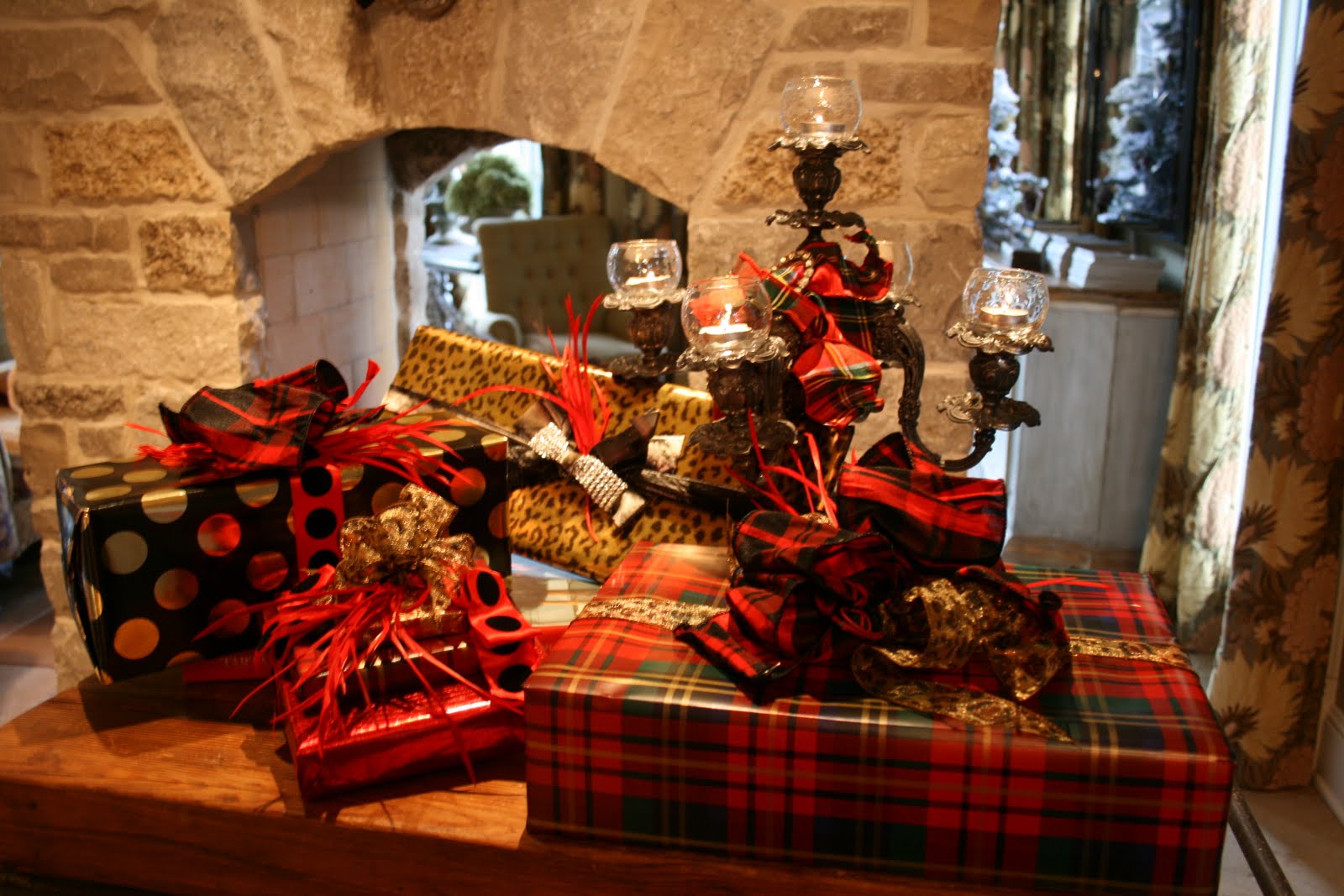 I spent yesterday getting my gifts ready to mail- last minute as usual! Tartan pattern was used as the over wrap, but of course it had to be romanced by a few of my favorite things- bling, leopard, feathers and polka dots for a little surprise element. This year we are selling the most beautiful tartan silk ribbons and I love this bold black and red buffalo check pattern. It looks great with the voile leopard ribbon from Sam's Club. Red feathers are used on most of the gifts to unify the presentation. Mixing all these elements together creates a unique gift wrap- so pretty to sit under a tree! So now into a box they go, heading south for the Holiday Season.