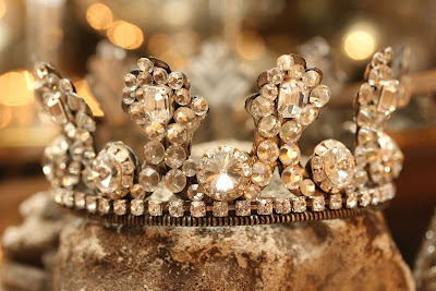 This is one of my favorite Christmas displays - the concrete old garden cherub fountain contrasted with the vintage crystal collection and old rhinestone pins. The crystal is a collection of vintage gold trimmed glasses, never an entire set, just what I happen to find and like. The gold leaf designs unify the collection. I use old rhinestone pins as Christmas decor. They look great sitting on little silver toothpick urns. A rhinestone crown sits on top of the head of the cherub adding a little holiday sparkle.