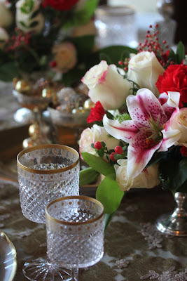 Christmas Brunch is the most traditional meal of our family's year. Traditional foods of daddy's fried oysters, Marshall Fields thin roll pancakes, and other family favorites continue to be served every year. Setting the table with a series of John Grossman salad plates, given to my by my old staff at Marshall Fields, brings a sense of nostalgia to the table. Mis-matched gold rimmed dinner plates are set on top of large Anna Weatherley chargers. The crystal is Bayel and was a beautiful pattern that was discontinued in the 1970's. Lot's of candle light, even though its morning , adds to the magic of the festive meal. Merry Christmas to all from our home to yours! Join us at Tablescape Thursdays to view more festive holiday tables at www.betweennapsontheporch.blogspot.com.