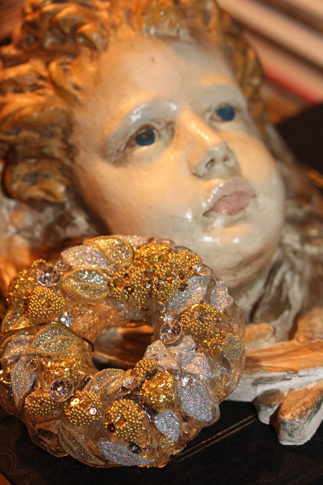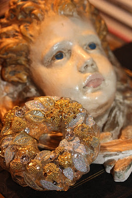 This is one of my favorite Christmas displays - the concrete old garden cherub fountain contrasted with the vintage crystal collection and old rhinestone pins. The crystal is a collection of vintage gold trimmed glasses, never an entire set, just what I happen to find and like. The gold leaf designs unify the collection. I use old rhinestone pins as Christmas decor. They look great sitting on little silver toothpick urns. A rhinestone crown sits on top of the head of the cherub adding a little holiday sparkle.