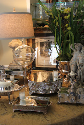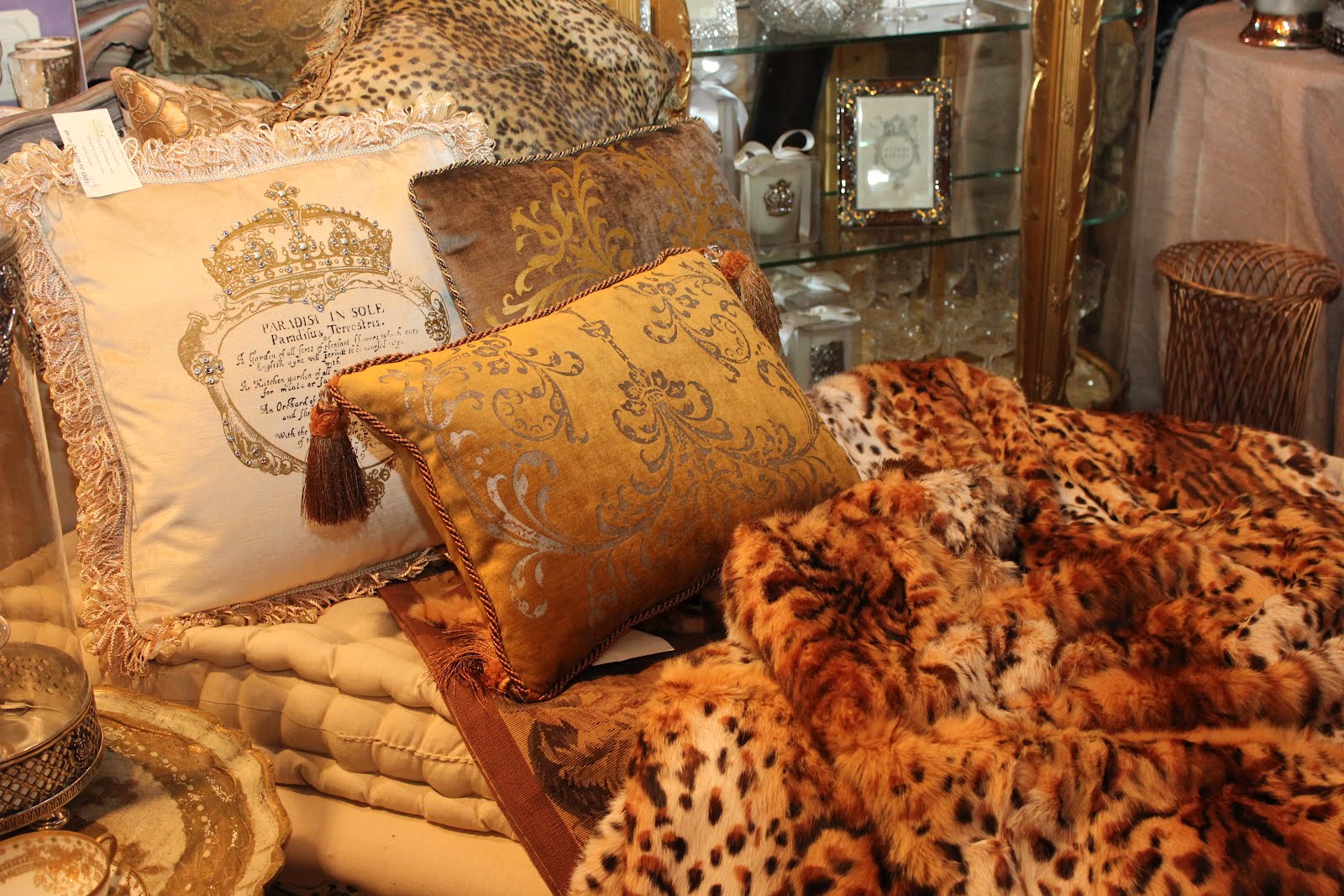 Simply two of my most exciting purchases from the Atlanta Gift Show arrived today- just in time for our Spring Open House. We displayed these little works of art on our French day bed sporting a tufted muslin mattress- such a contrast of elements! These gorgeous pillows are made of velvet and are hand painted with a beautiful design. Some are embellished with crystals. All are available in a choice of colors and have pretty trims and tassels. They look divine on our rabbit throws- available in grey, brown or stenciled leopard designs. I can't wait for our customers to see these on Friday! Join us for our Spring Open House on Friday and Saturday, March 9th and 10th from 10 am to 5 pm. Don't miss the Special Antique Trunk Show from Savvy City Farmer these 2 days only!