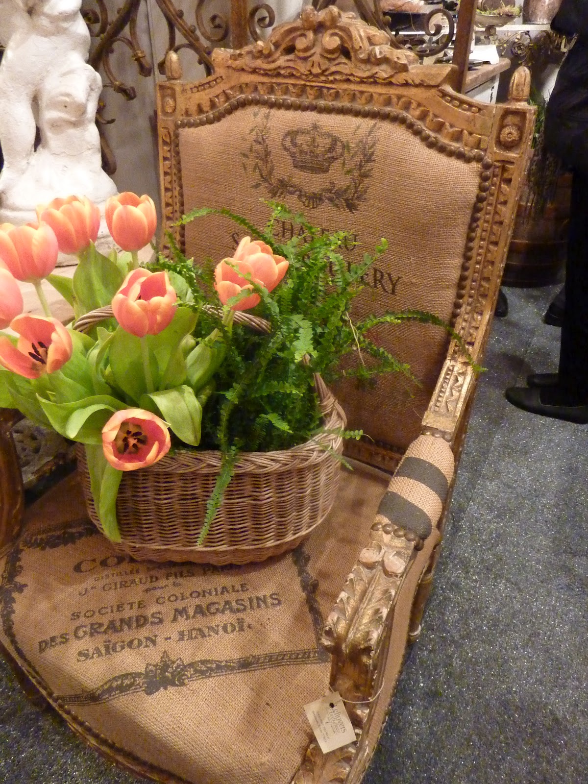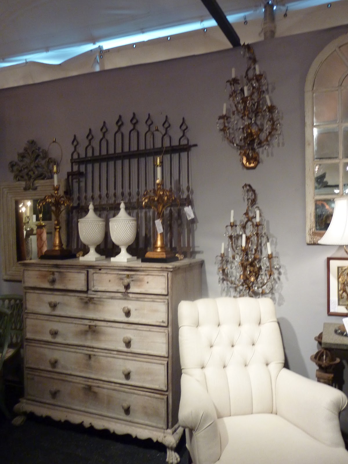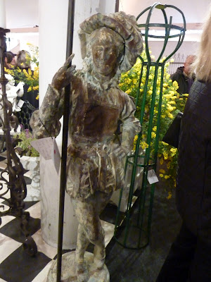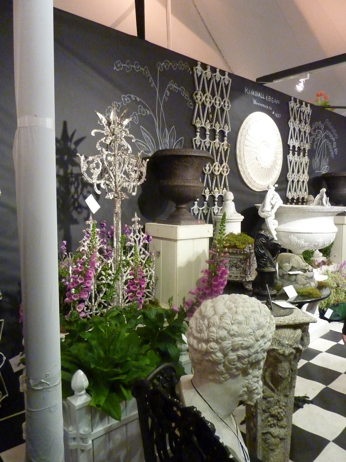 Yesterday was an inspiring day. Jill and her sister, Nancy, and I had breakfast, then headed for the annual Chicago Botanic Garden Antique Show. It was a delight to wander through the show and just look at carefully edited displays of antiques for the home. Some of the most beautiful urns were assembled for the show and filled with gorgeous flowers. One of my favorite booths was a store called Leftovers, located between Austin and Houston in a small town called Brennan. The first four pictures show the unique home accessories that they were selling. I'll have to send my friend Mariterese to check out their 10,000 sq. foot store! There was lots of silver to contrast the crusty old garden elements- love the white roses in the silver samovar. Picture number 6 was a clever way to create a gazebo effect in your yard without actually building one. Notice the trellis backed stools placed around the table, creating this romantic setting by Craig Bergmann. (Gosh I miss his wonderful store.) As you entered one of the tents, there was a romantic communal style table of white china, silver, boxwood and grass covered benches- to die for gorgeous! Kimball and Bean"s booth was a delight for the eyes with the Venetian statues guarding the entrance of their dramatic black and white display. but my favorite booth was the last 2 pictures - the over scaled crusty urn of flowers on the antique pine table in front of the huge zinc pier mirror. It was simple, edited with only the best elements and stunning! What a fun day- we came away inspired and ready to create our own little versions of the displays!
