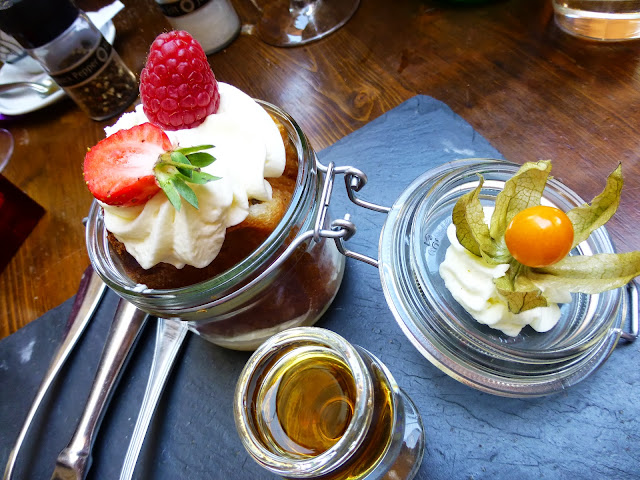 But ultimately I settled on the Rum Baba!  This was the prettiest presentation on Rum Baba on the trip so far.  A yummy pastry filled with whipped cream in the canning jar and a sherry glass filled with rum to pour over the desired amount!  It was wonderful!