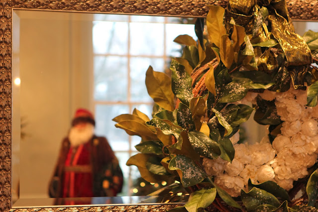 Snowy magnolia wreath with a glittered peony wreath placed inside adorns the long mirror.