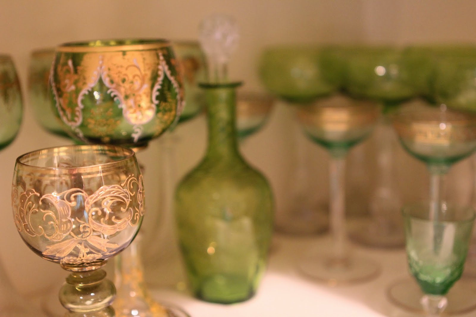 My collected grouping of mis- matched Venetian green glasses, many of them gifts.